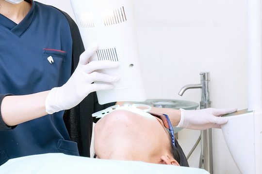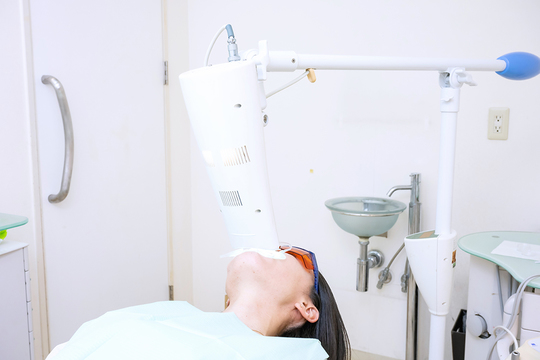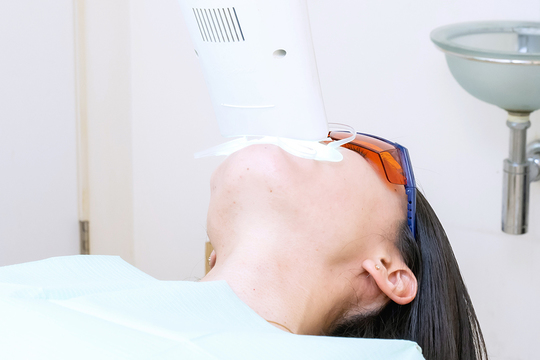 歯科医院内で行うホワイトニングです。歯の表面に薬剤を塗り、光を照射して歯を白くしていきます。